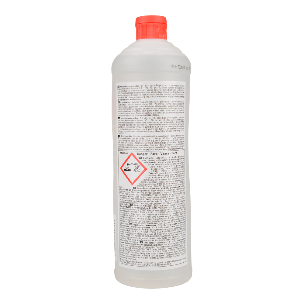 Into Clean er et flydende surt universelt kalkfjerningsmiddel til daglig og periodisk kalkfjerning med særlig god rengøringsevne. Produktet tilsættes rengøringsvandet i den angivne mængde, opløsningen påføres den tilkalkede overflade og bearbejdes med klud, svamp eller børste. Der efterskylles med rent vand. Eftertørring er ikke nødvendig. Lettere kan det næsten ikke være.